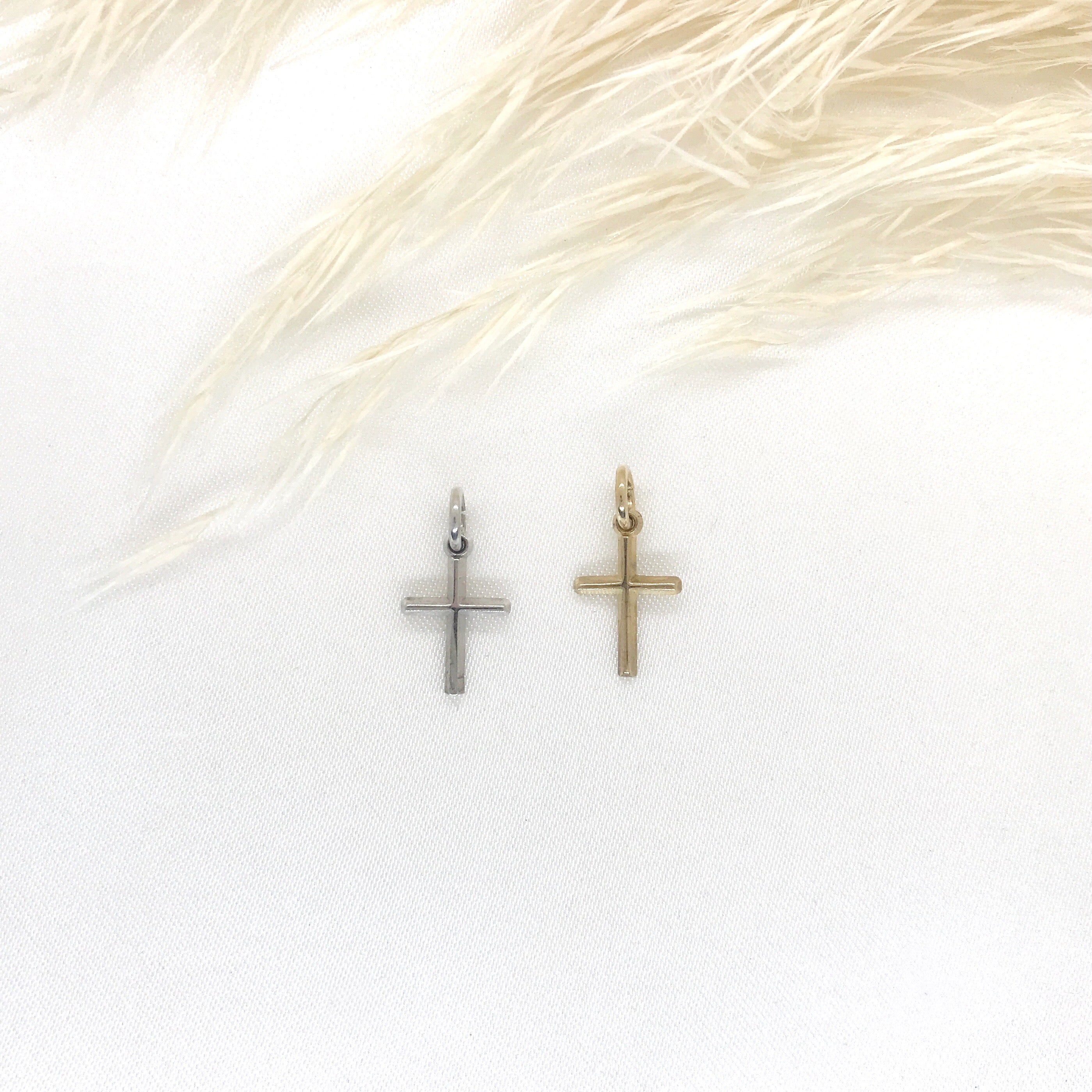 This 10k Gold mini cross is perfect to add to a necklace, bracelet or pin for a holy sacrament! Beautiful and dainty, it is great to layer with other pieces. Available in white or yellow gold.