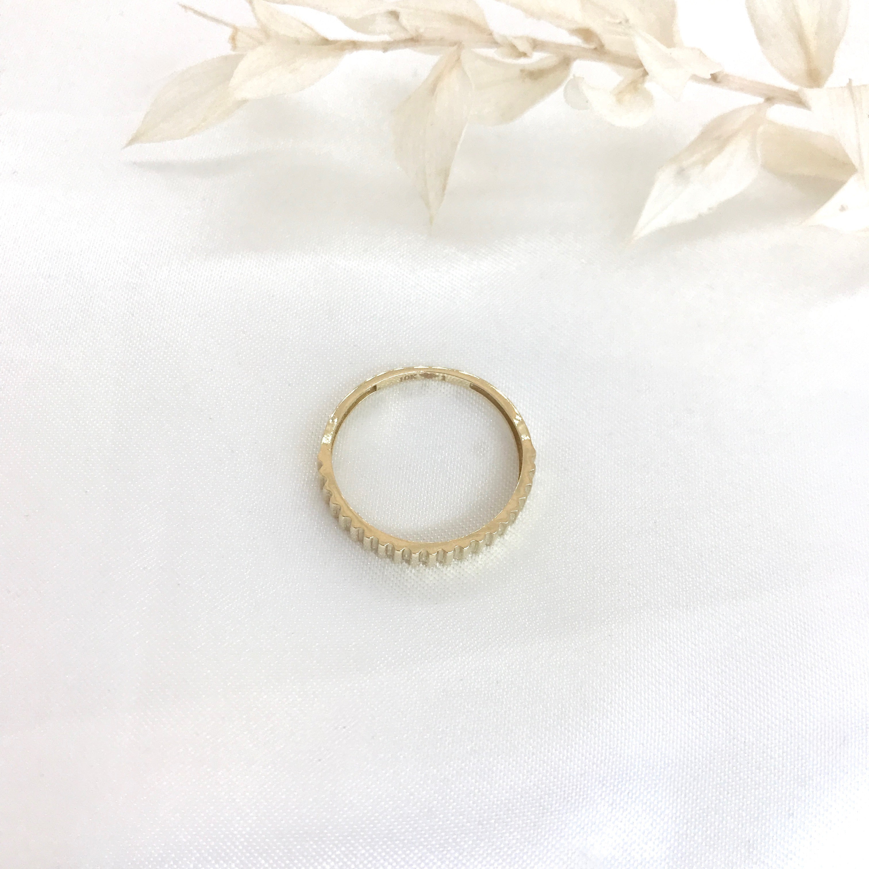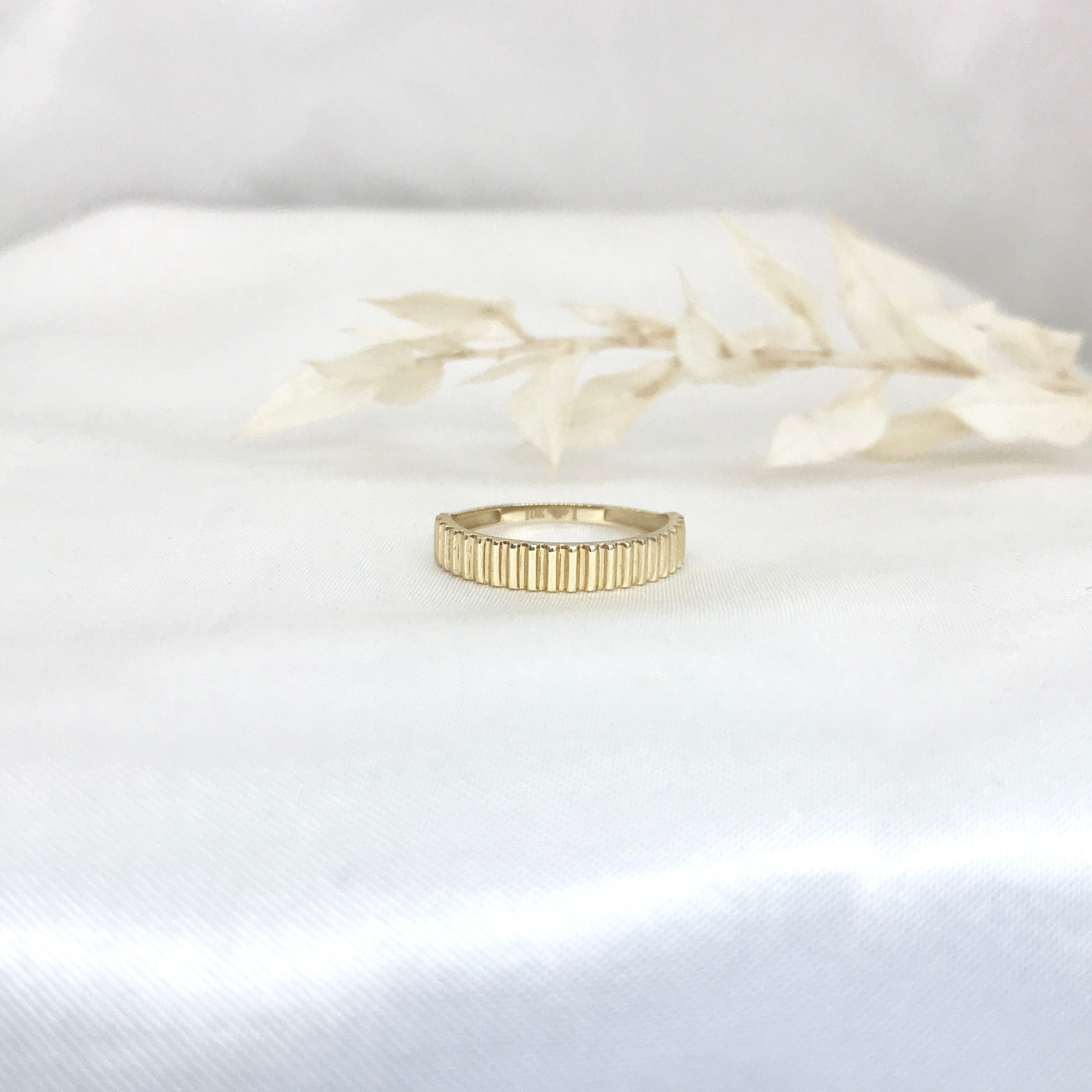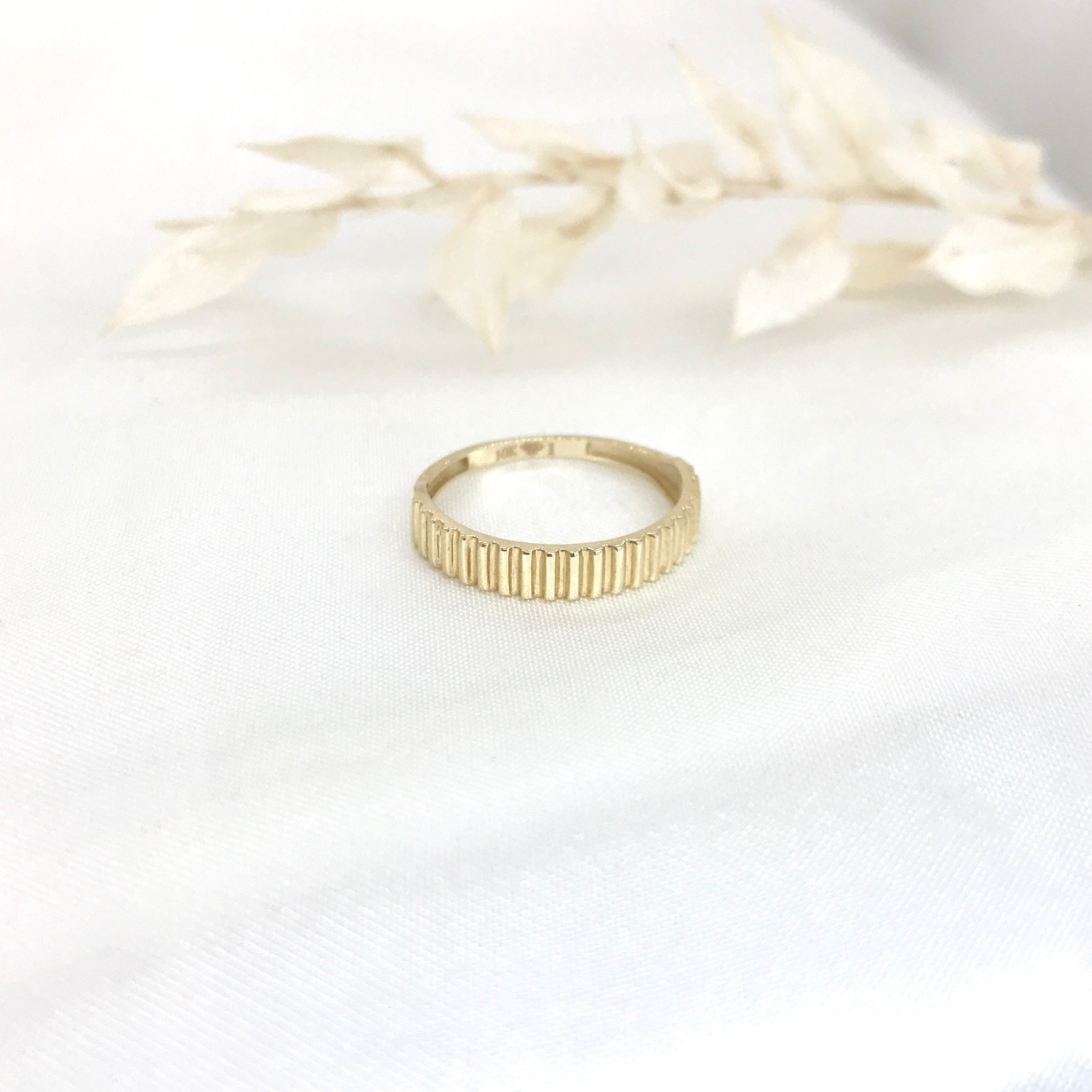 This elegant 10k Yellow Gold Ribbed Stackable Ring features a finely textured ribbed design that adds a touch of sophistication and versatility. Its slender band is perfect for stacking with other rings, allowing you to create a personalized look. This timeless design makes a stylish addition to any jewelry collection.