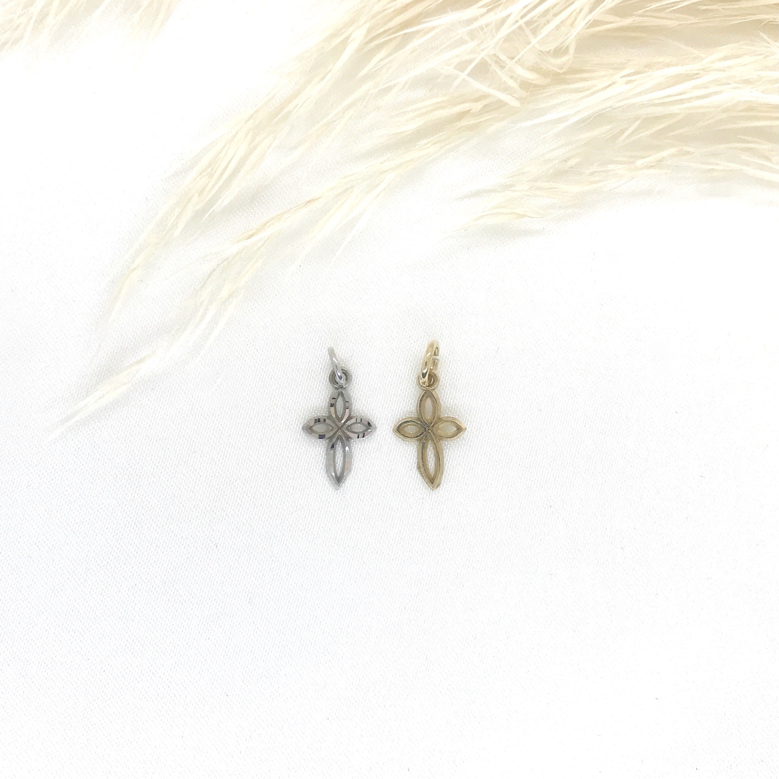 This 10k Gold cross is perfect to add to a necklace or bracelet for a holy sacrament! Beautiful and dainty, it is great to layer with other pieces.