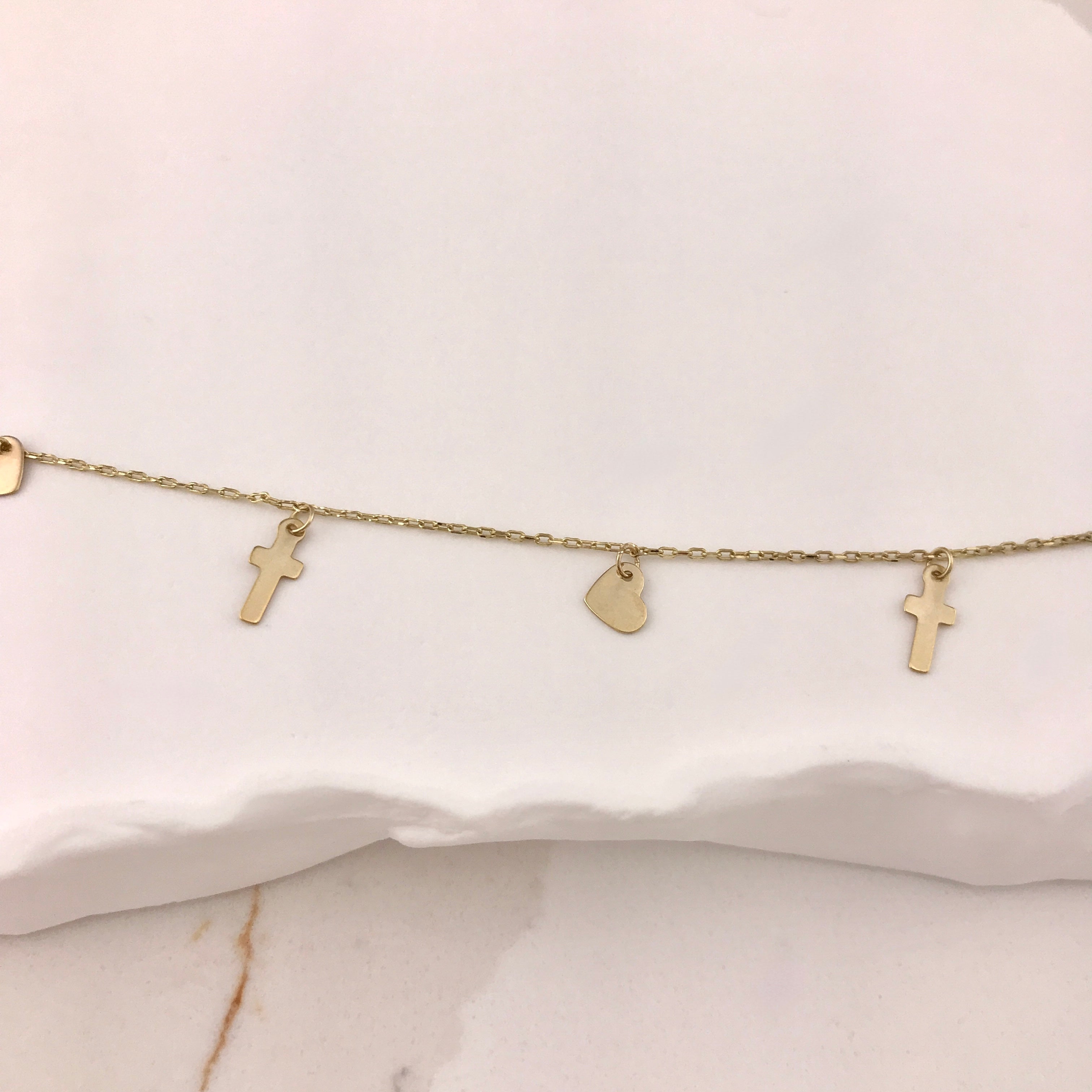 10k Yellow Gold Cross & Heart Dangle Bracelet