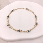 Crafted in 10K Yellow Gold, this double strand bracelet blends dainty style with traditional symbolism. The classic blue evil eye charms add a touch of protection while keeping the design light, feminine, and easy to wear. Its delicate chains create soft movement, making it a beautiful everyday bracelet or a thoughtful gift.