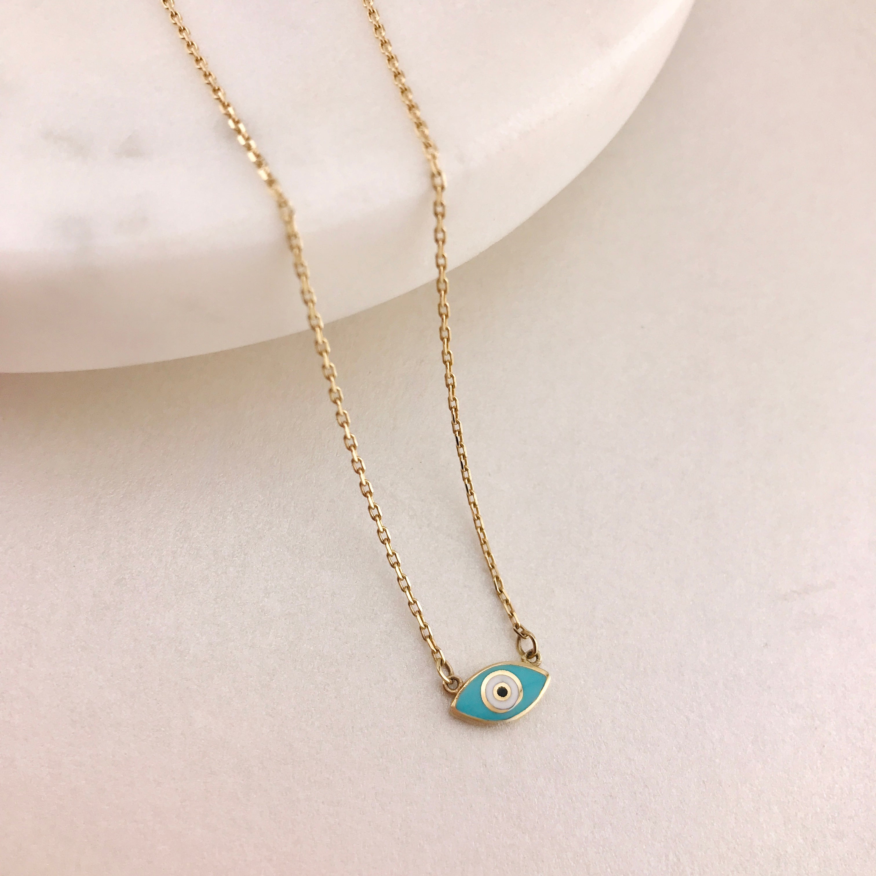 This 10k Gold dainty evil eye necklace is the perfect gift! Featuring a double sided blue enamel evil eye. The evil eye is given for good karma, positive energies, and protection against unwanted evil. This is a perfect gift for a loved one or for yourself.