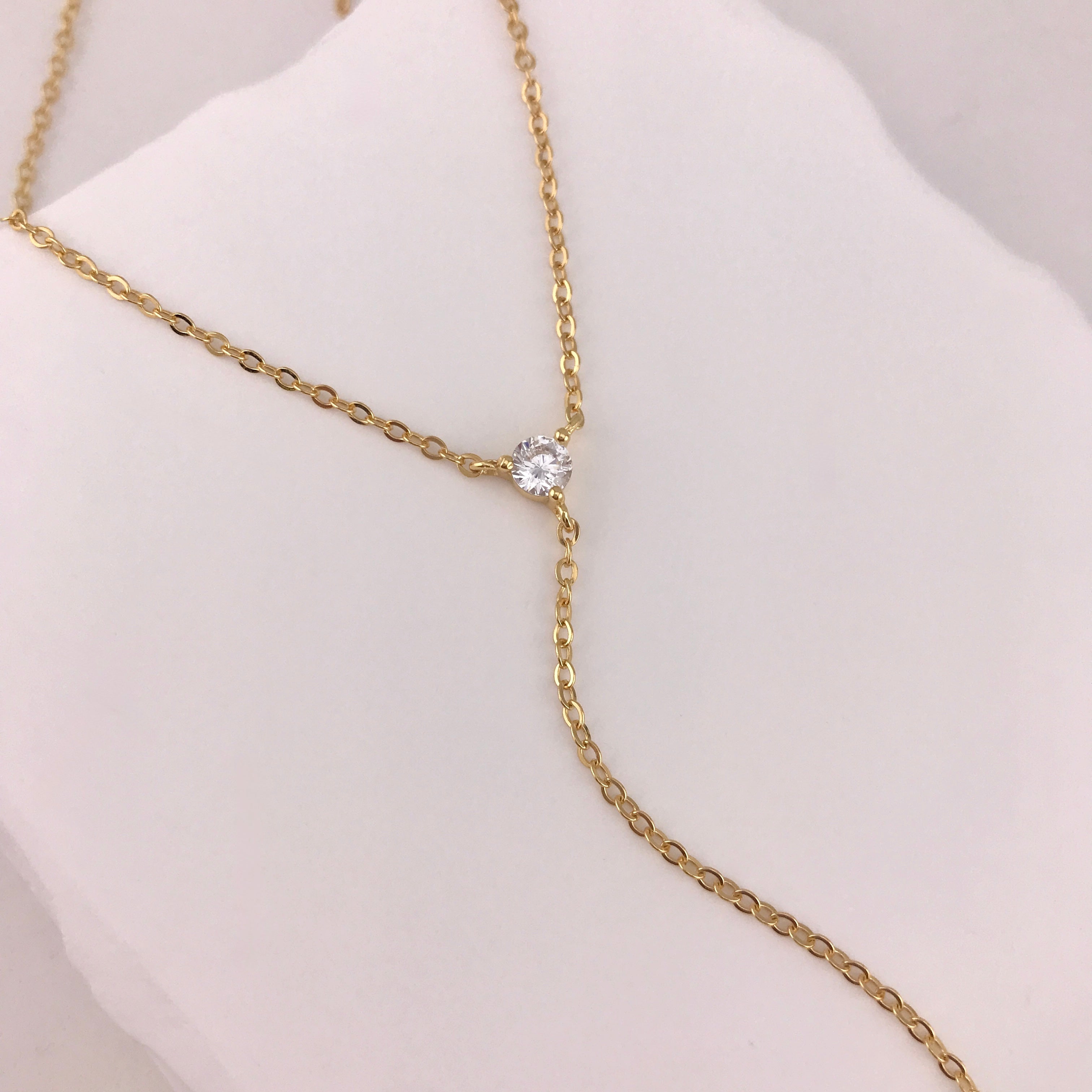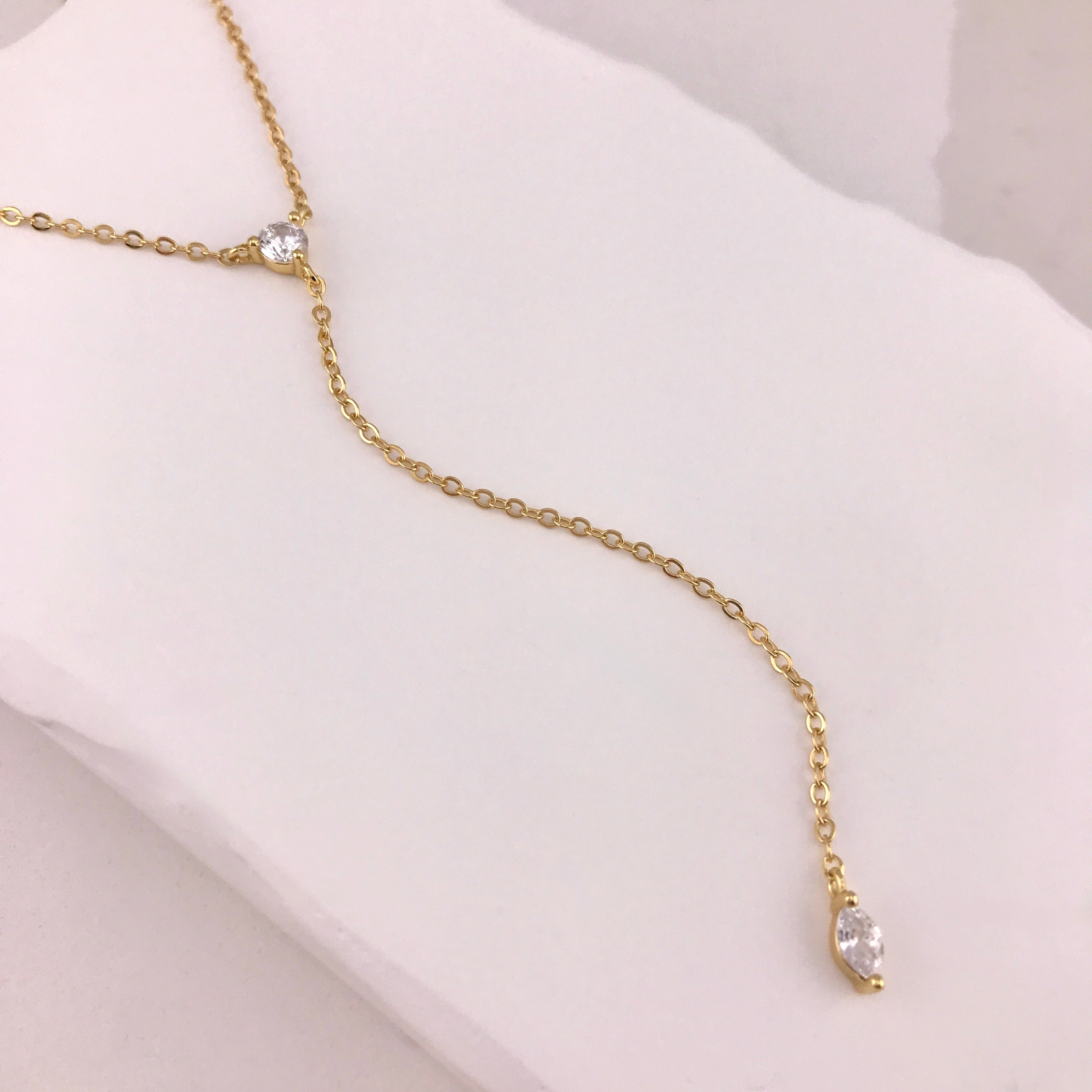 Gracefully minimal with a touch of elegance, this Y-shaped necklace features two sparkly cubic zirconia stones suspended on a fine 18k yellow vermeil chain. Its sleek silhouette flatters any neckline—perfect for both everyday sophistication and dressed-up evenings. An elegant piece that captures the essence of effortless femininity.