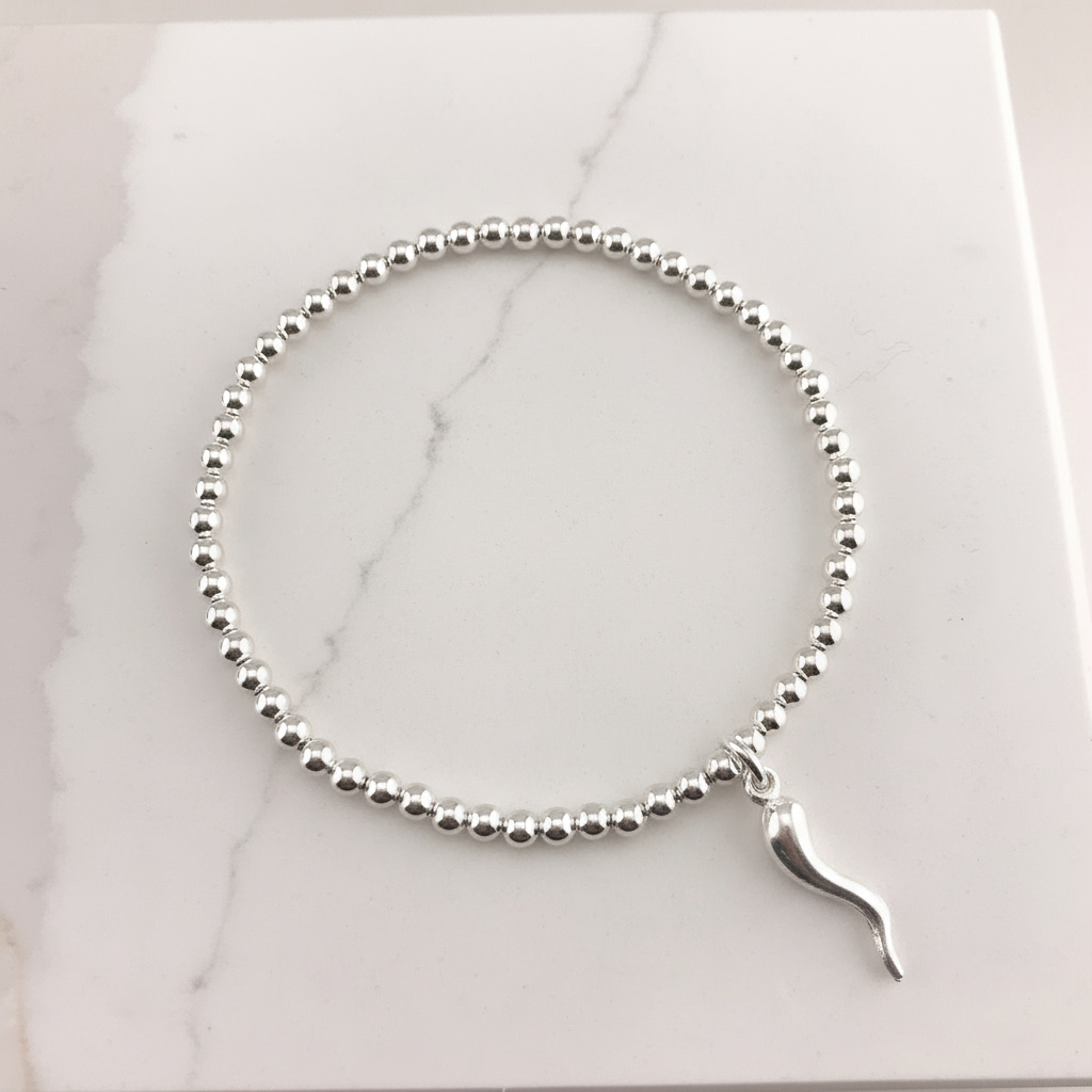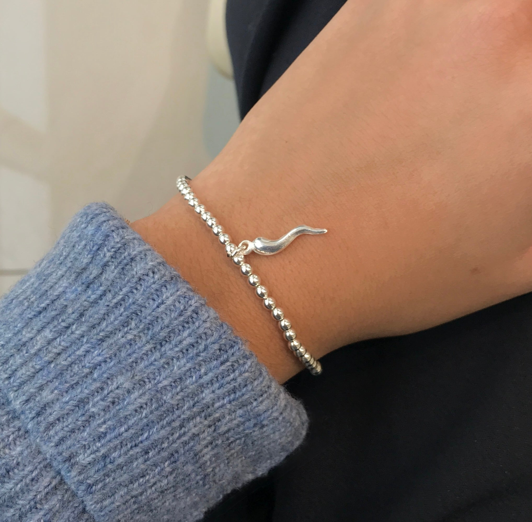 This beautiful 925 Sterling Silver stretch bracelet with the Italian corno (pepper) is a perfect gift for yourself or a special someone. The cornetto is recognized as a symbol of good luck, protection, and prosperity, and it is often given as a gift to loved ones in need of extra protection.