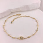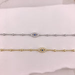 Keep good vibes close with this sparkling evil eye bracelet, crafted in 18k gold vermeil over sterling silver. Choose between radiant yellow or cool white gold, both adorned with brilliant cubic zirconia. A playful talisman that blends protection with style—wear it solo or stack with your favorites for instant personality.