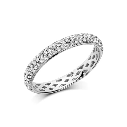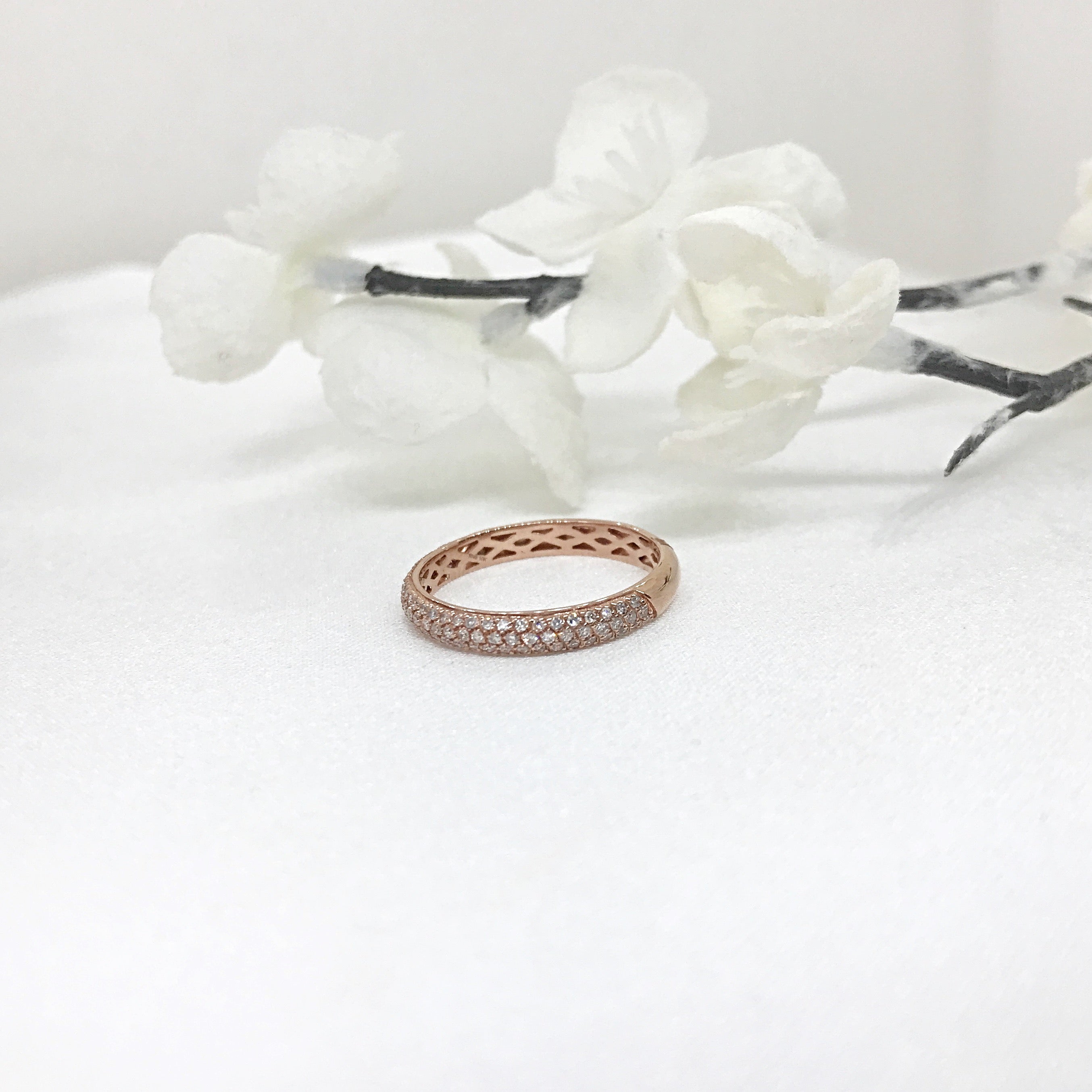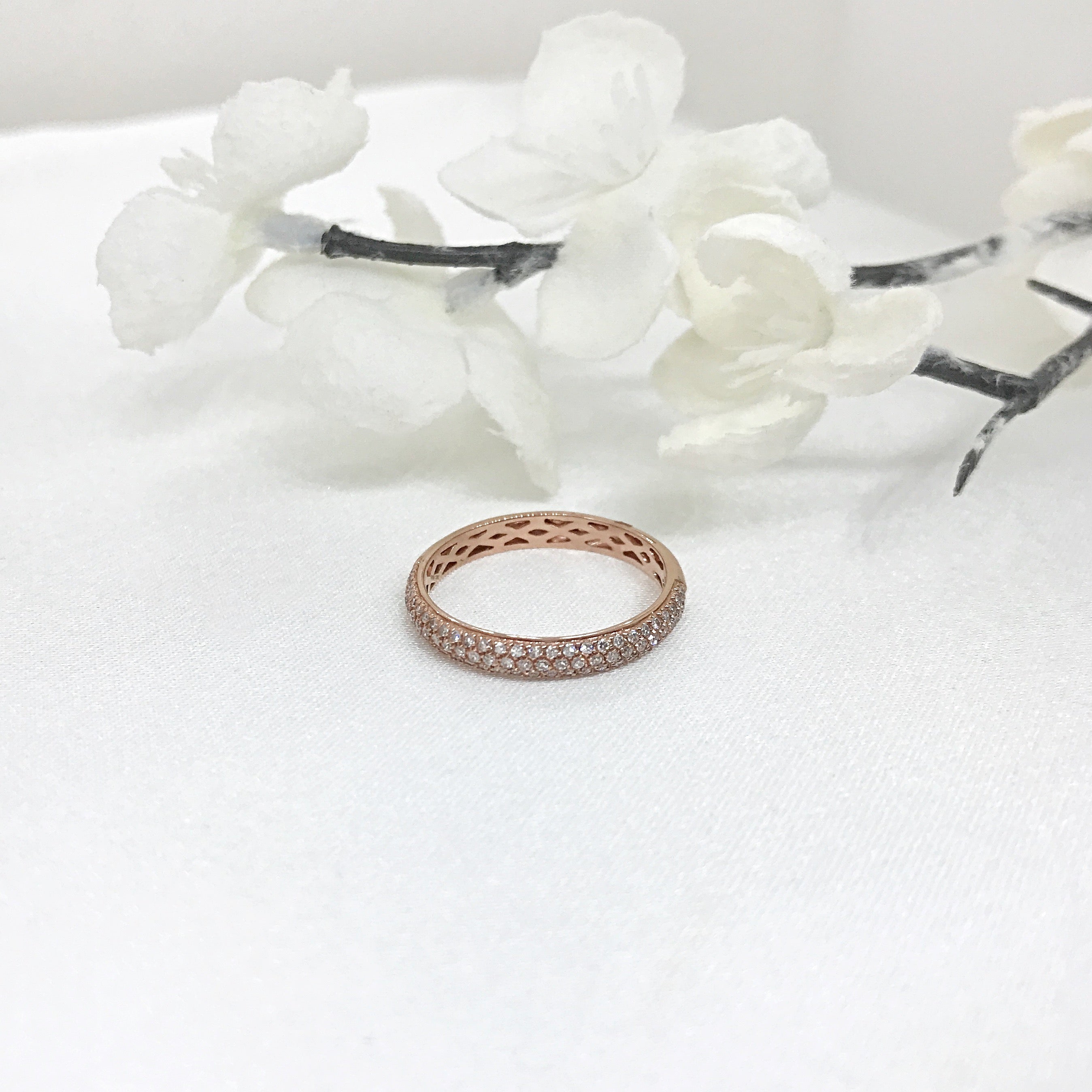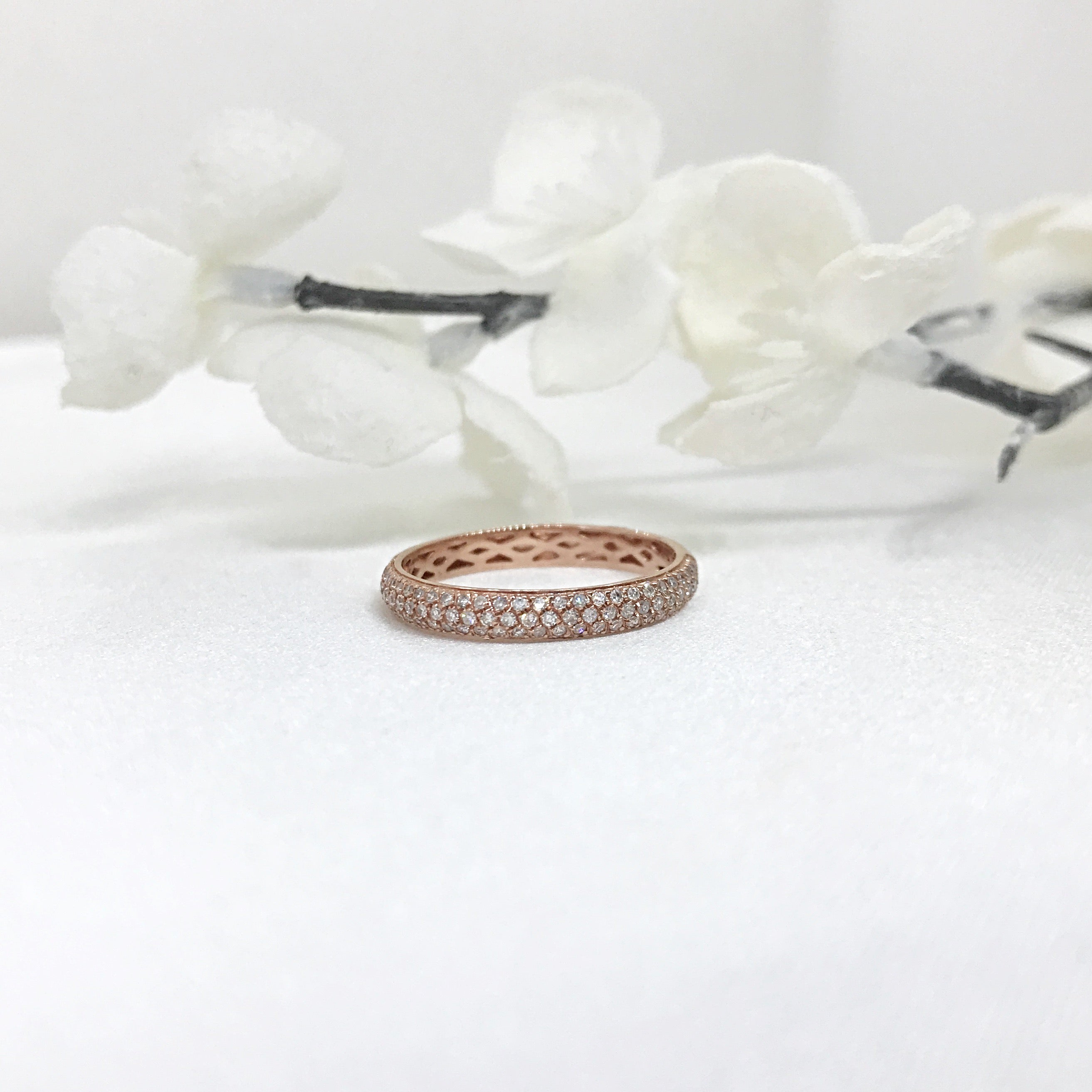 This 10k Semi Eternity pave diamond ring is a perfect addition for your ring stacks. Smooth and comfortable for everyday use, yet sparkly and sexy to layer for a fun night out.