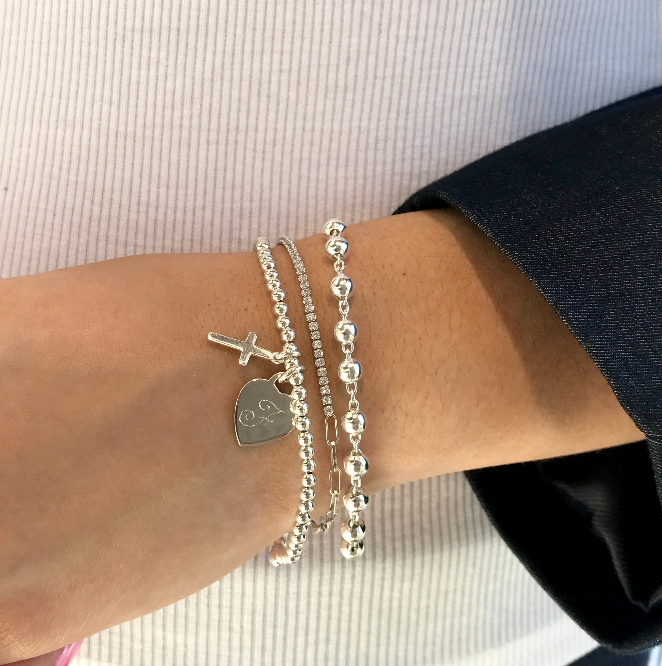 This Silver stretch bracelet is great for any occasion! Simple and charming, It looks great on its own or with layers. Available in 3 different sizes to make it the perfect gift for everyone from kids to adults. Add a personal touch and engrave initials, date, or short word.