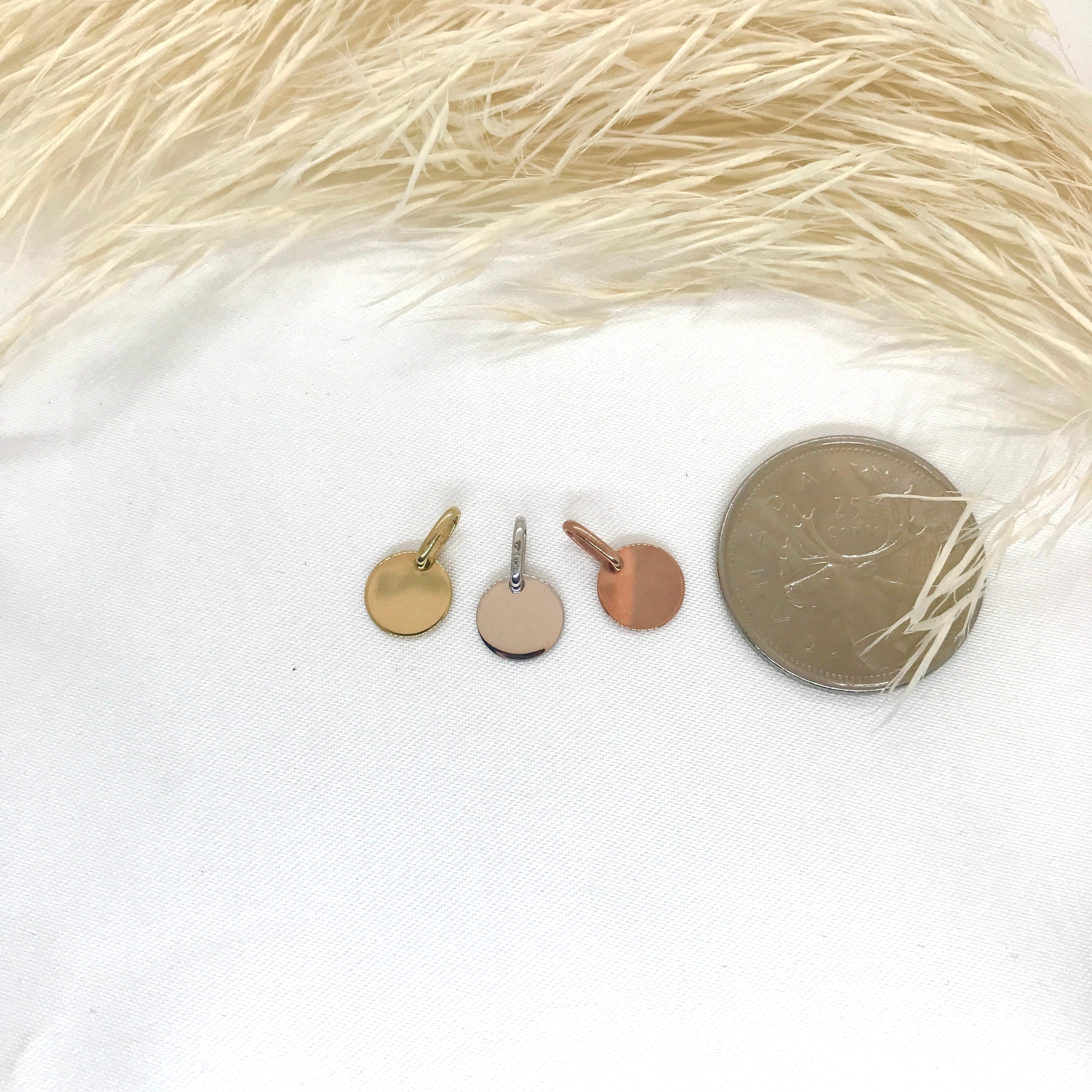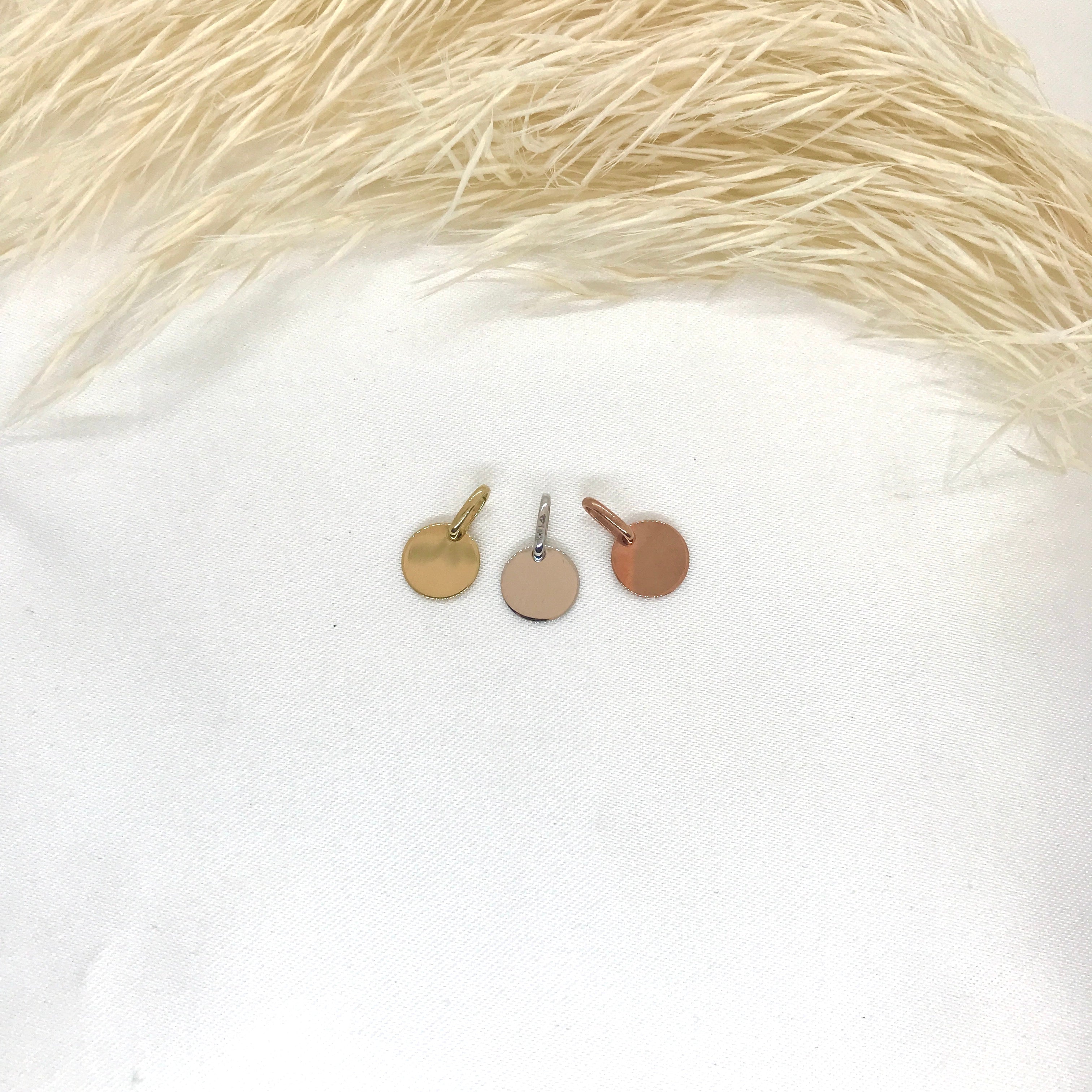 This tiny disc pendant is perfect to add to a necklace, bracelet, or pin! Add something unique to your jewellery by engraving it with a special date, initial, or word! Available in yellow, white, or rose gold!