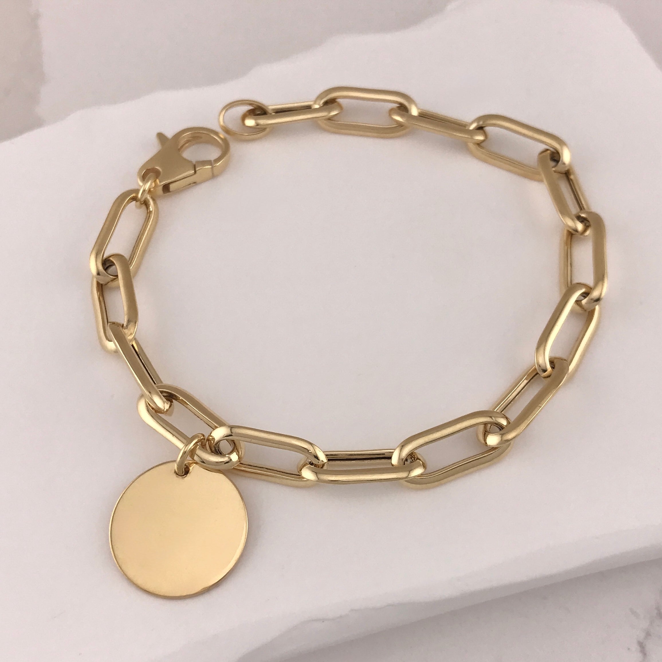 The Miss Mimi bold paper clip chain design is modern must-have. Perfect for everyday wear, this 14k Gold Vermeil over 925 Sterling Silver bracelet features a customizable disc pendant.