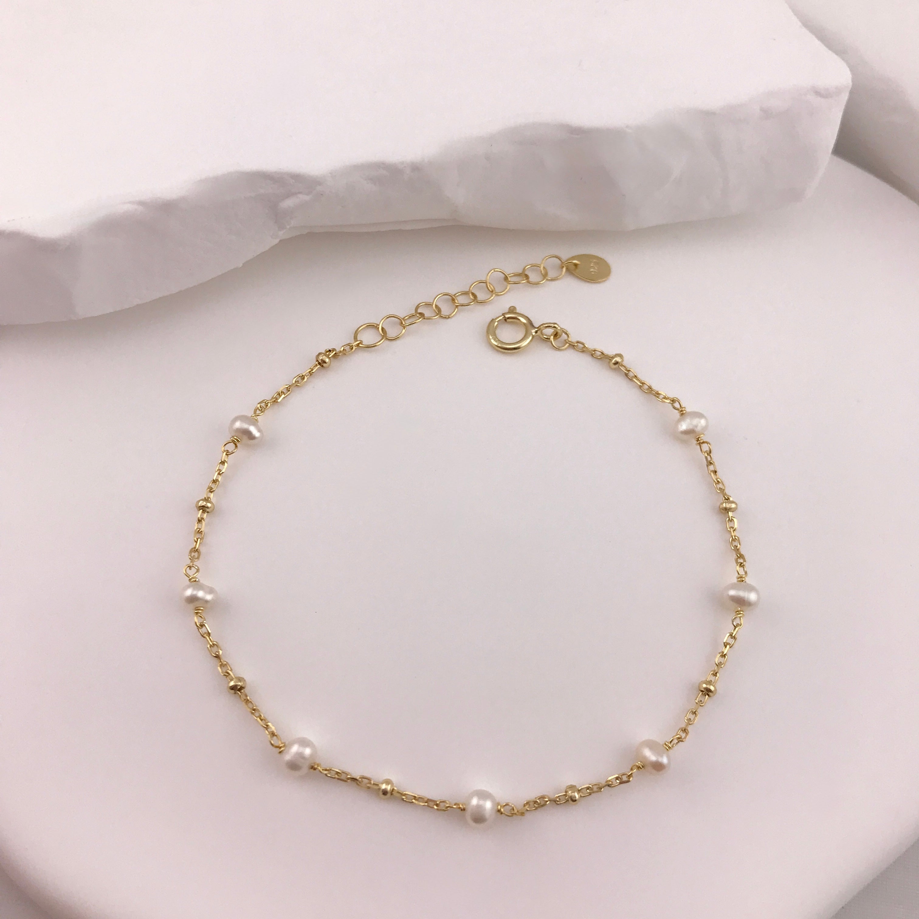 A dainty 18k yellow vermeil bracelet with spaced freshwater pearls and vermeil beads, designed for lightweight, everyday elegance.