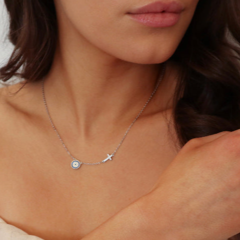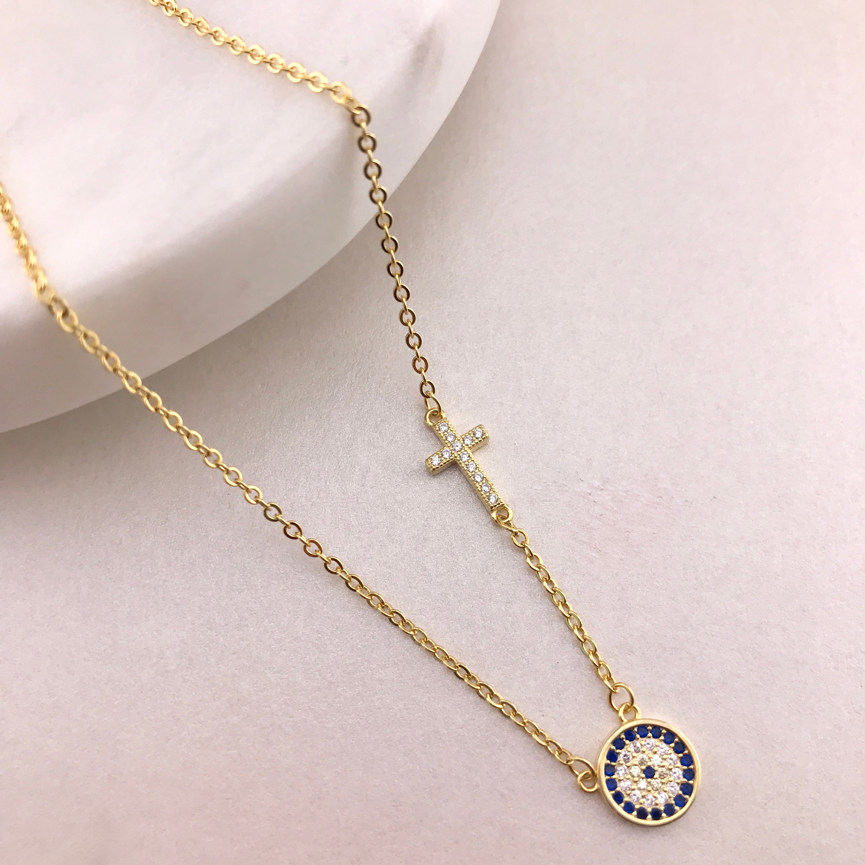 This beautiful 925/18k Vermeil necklace combines the modern and the classic, featuring a Cubic Zirconia cross and evil eye! The evil eye is given for good karma, positive energies, and protection against the evil eye. Wear it with the matching bracelet for even more luck and protection!