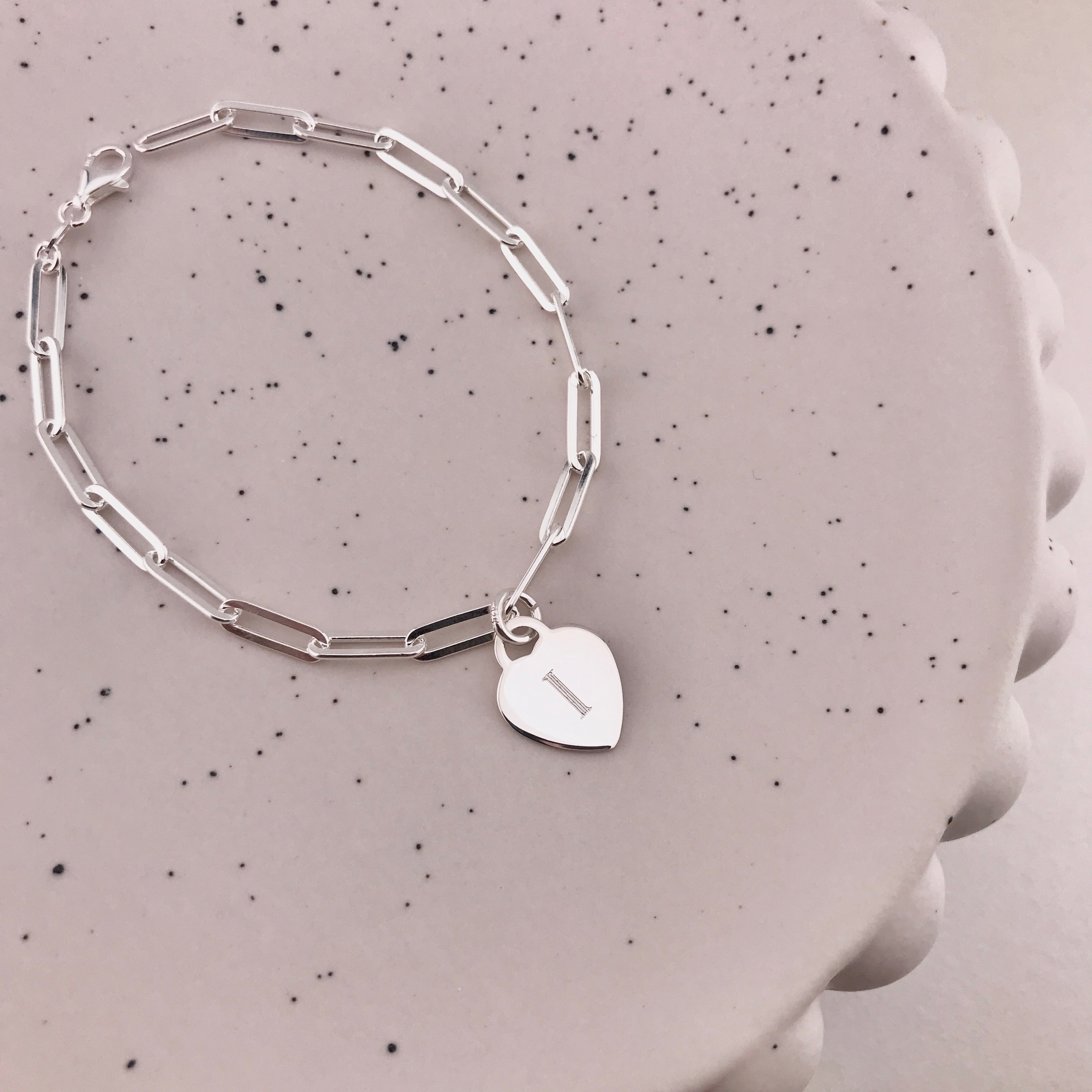 This bold paper clip chain design is modern must-have. Perfect for everyday wear, this Sterling Silver bracelet features a customizable heart pendant. Add a personal touch and engrave initials, date, or short word.